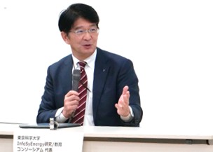 ISE 代表の伊原学教授(物質理工学院 応用化学系)より、本コンソーシアムの 2025 年度活動報告が行われ、国際ワークショップや共同研究、博士人材育成プログラムの推進に加え、分散型電源・データセンターの取り組みやカーボンニュートラル技術の共同研究など、研究と教育を一体的に進める活動が紹介されました。